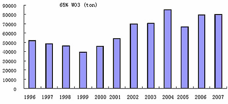 中國(guó)タングステン出力コンセントレイト 1996-2007 (トン)